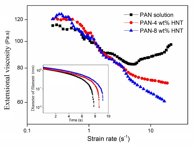 We characterized the shear and extensional flow properties of polyacrylonitrile (PAN)/dimethylacetamide solutions in the presence of halloysite nanotubes (HNTs) at industrially relevant polymer and filler concentrations for this system. We monitored thinning dynamics of these solutions by capillary breakup extensional rheometery (CaBER). We found that the introduction of HNTs to PAN solution improves the life-time of the filament. Additionally, the filled solutions exhibited enhanced physical structures and elasticity. The shear and extensional behavior of PAN solution with ≤ 8 wt% HNTs showed that these solutions could be still processed under similar conditions as neat PAN solution.