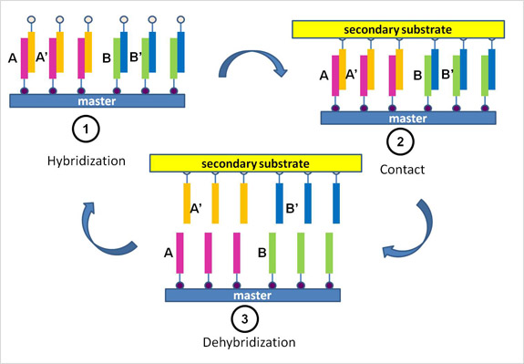 DNA arrays have revolutionized the field of biomedicine since they allow the analyses of several different DNA sequences in parallel. [1] Current methods to fabricate such arrays are serial in nature resulting in high prices that prevent the extensive utilization of those arrays. [1,2] Supramolecular Nanostamping is devised to solve this problem by harnessing the reversible bond formation between complementary DNA strands. This contact based technique replicates DNA arrays in a three steps: 1) Hybridization, 2) Contact and 3) Dehybridization. [3]